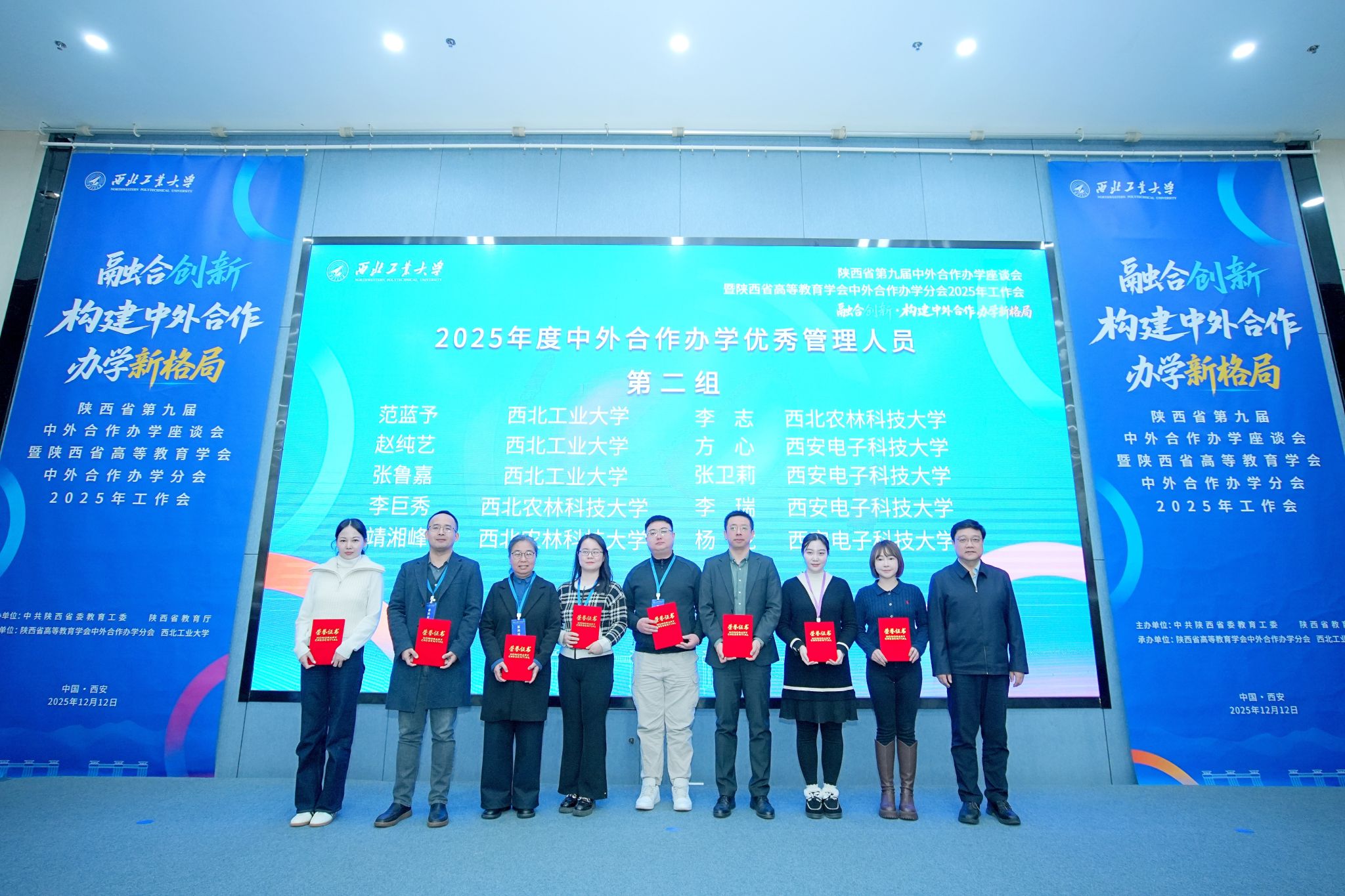 2025年12月12日,陕西省第九届中外合作办学座谈会暨陕西省高等教育学会中外合作办学分会2025年工作会在西北工业大学长安校区召开,教育部国际合作与交流司副司长陈大立、陕西省委教育工委副书记、一级巡视员王海波、陕西省高等教育学会副会长兼副秘书长姚聪莉、陕西省教育厅外事处处长文通参加会议,西北工业大学党委常委、副校长岳晓奎致欢迎辞。会议对2025年度优秀机构(项目)、管理人员、专家和组织单位予以表彰。