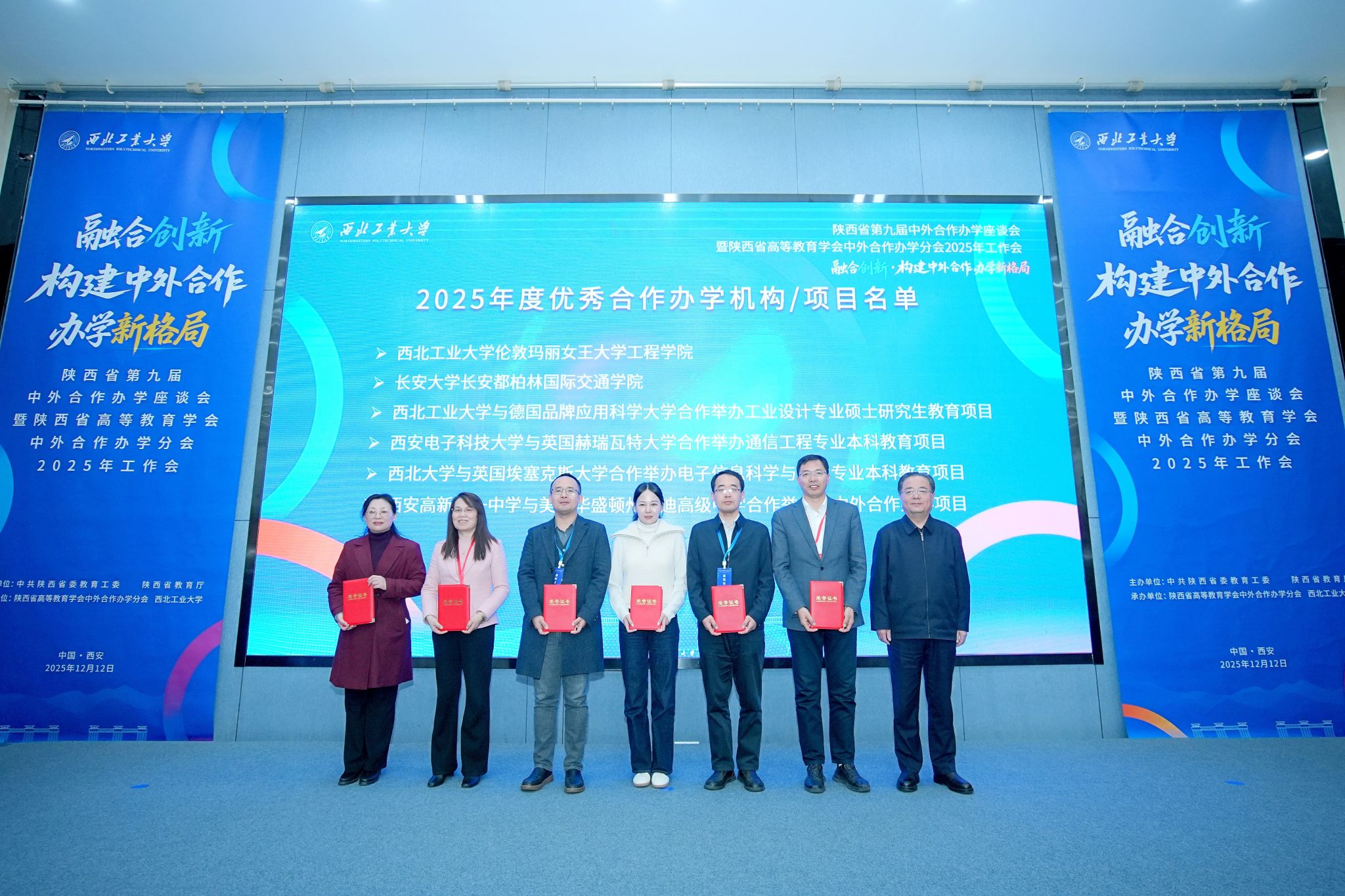 2025年12月12日,陕西省第九届中外合作办学座谈会暨陕西省高等教育学会中外合作办学分会2025年工作会在西北工业大学长安校区召开,教育部国际合作与交流司副司长陈大立、陕西省委教育工委副书记、一级巡视员王海波、陕西省高等教育学会副会长兼副秘书长姚聪莉、陕西省教育厅外事处处长文通参加会议,西北工业大学党委常委、副校长岳晓奎致欢迎辞。会议对2025年度优秀机构(项目)、管理人员、专家和组织单位予以表彰。